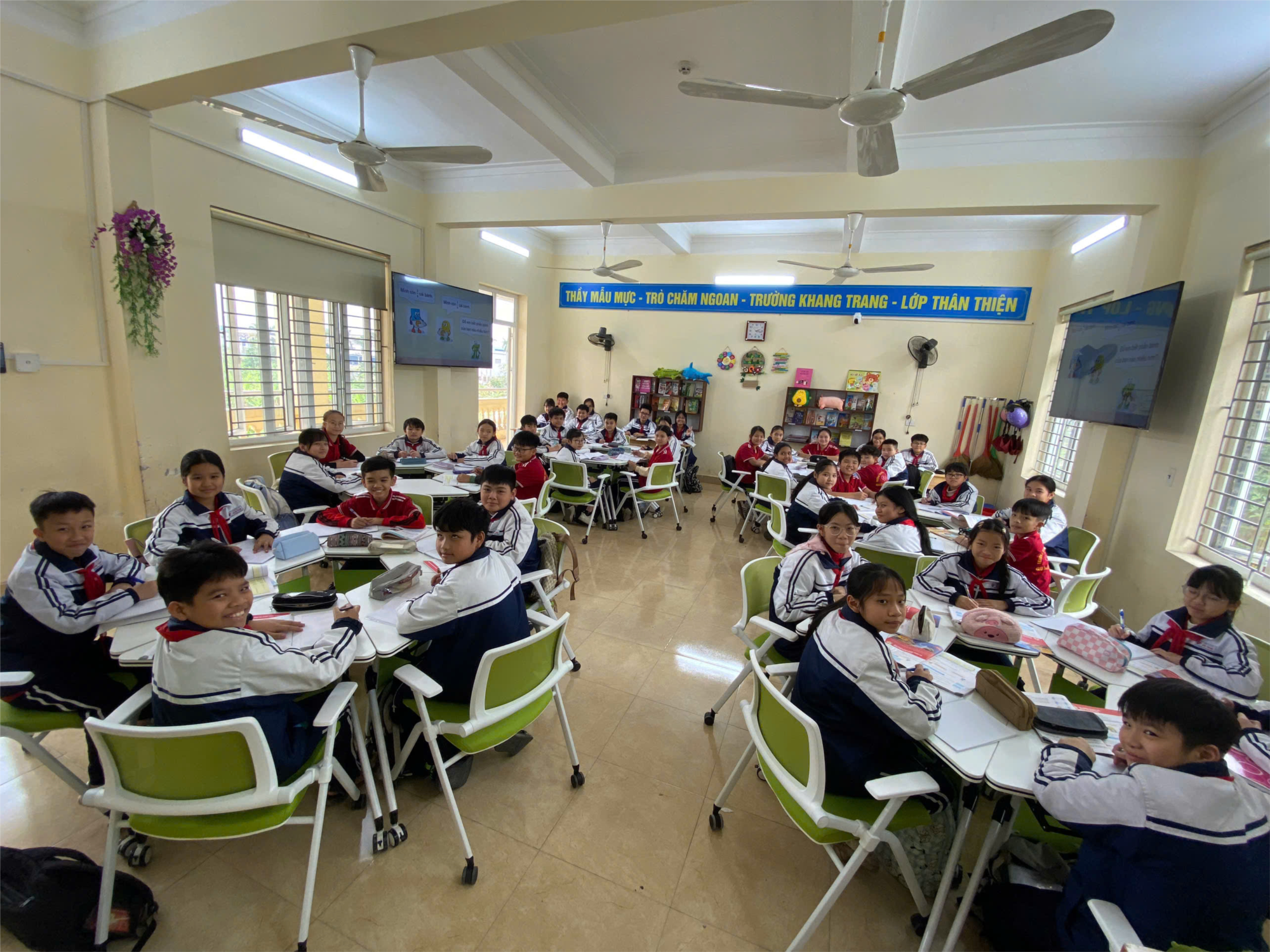 Phòng học có một màn hình tương tác lớn, là màn hình chính cho cô trò giảng dạy và học tập; hai ti vi 75 inch hỗ trợ việc quan sát màn hình chính cho học sinh; một máy điểm danh khuôn mặt để kiểm diện học sinh; hệ thống bàn ghế nhập khẩu; loa có màn hình kết nối với ti vi. Ngoài ra trường còn được cấp 16 laptop, 26 máy tính bảng.
