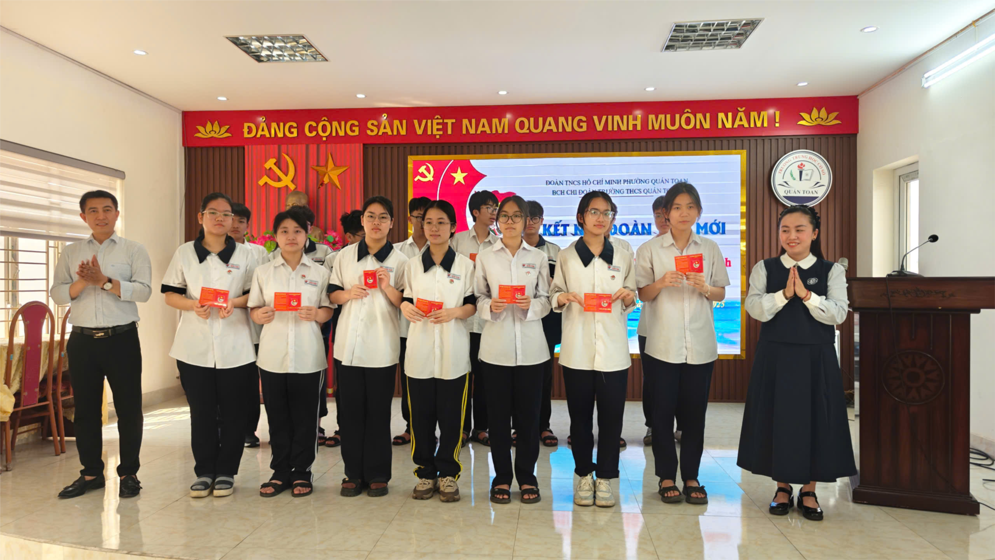 Buổi lễ vinh dự đón tiếp Bà Nguyễn Thị Thùy Linh - Phó bí thư Đoàn phường Quán Toan; Thầy giáo Đỗ Văn Khánh - Phó hiệu trưởng trường THCS Quán Toan; Thầy giáo Lê Bá Nhật - Bí thư Chi đoàn; cùng toàn thể các thầy cô giáo, các em học sinh trong nhà trường. Sắc đỏ của cờ Tổ quốc, cờ Đoàn hòa cùng ánh mắt rạng ngời của các tân Đoàn viên tạo nên không gian trang nghiêm, xúc động, khơi dậy niềm tự hào về lý tưởng và sứ mệnh tuổi trẻ. Lễ kết nạp Đoàn viên mới diễn ra trong không khí trang nghiêm. Đồng chí Lê Bá Nhật, Bí thư chi đoàn trường THCS Quán Toan, công bố quyết định trưởng thành Đội, đánh dấu sự chuyển mình quan trọng của các đội viên tiêu biểu. Tiếp đó, 43 đội viên ưu tú chính thức vinh dự đứng vào hàng ngũ Đoàn TNCS Hồ Chí Minh. Đây là những học sinh không chỉ có thành tích xuất sắc trong học tập mà còn tích cực tham gia phong trào, thể hiện tinh thần trách nhiệm và ý chí phấn đấu không ngừng.